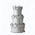 Три яруса этого свадебного торта переливаются серебристым сиянием. Нежные цветы из крема создают изящный узор, стекая каскадом по гладкой поверхности. Холодный металлический блеск сочетается с мягкими линиями, придавая композиции современный и элегантный вид. Серебряные акценты мерцают под светом, напоминая драгоценные украшения.