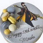 Серый торт с элегантной фотопечатью персонажей Genshin Impact создает атмосферу загадочности и волшебства. Нежные макаруны и серебристые акценты добавляют торжественности. Лаконичный дизайн подчеркивает современный стиль, а приглушенная цветовая гамма вызывает ощущение гармонии и изысканности.