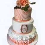 Трёхъярусный торт в нежных пастельных тонах украшен изящной розой и золотыми акцентами. Элегантная композиция с цветочными элементами создаёт атмосферу торжественности и утончённости. Мягкие переходы оттенков и деликатный блеск делают этот десерт настоящим произведением кондитерского искусства.