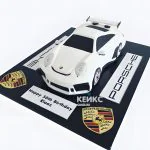 Белоснежный торт в виде элегантного автомобиля Porsche. Четкие линии кузова, рельефные фары и узнаваемый логотип создают впечатление миниатюрной копии роскошного спорткара. Серебристые диски и черные детали добавляют графичности композиции. Современный и стильный десерт для ценителей автомобильной эстетики и лаконичного дизайна.