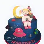 Космический торт погружает в загадочную атмосферу вселенной. Глубокий синий фон украшен мерцающими звездами и изящными планетами. Яркие ракеты и летающие тарелки создают динамичную композицию. Серебристые кратеры и созвездия добавляют объем и реалистичность. Каждая деталь переносит в межзвездное путешествие, пробуждая детский восторг и любопытство к неизведанному.