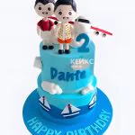 Синий двухъярусный торт украшен аппликациями из мастики в морской тематике. На верхнем ярусе изображен самолет, а на нижнем — корабли, плывущие по волнам. Белые облака и яркие детали создают праздничное настроение, идеально подходящее для двойняшек.