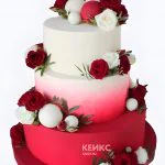 Роскошный трехъярусный торт в насыщенных красных тонах. Нежные кремовые розы создают объемную текстуру, а золотые шары добавляют торжественности. Сочетание бархатного красного и сияющего золота создает праздничное настроение. Идеально передает элегантность и радость свадебного торжества.