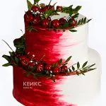Этот свадебный торт словно воплощение страсти и нежности. Два яруса, покрытые гладким кремом, переливаются глубокими оттенками красного. Насыщенные вишни, рассыпанные по поверхности, создают эффект роскоши и изысканности. Нежные цветы из крема добавляют торту воздушности, перекликаясь с романтичной атмосферой свадьбы. Контраст ярких ягод и бархатистой глазури завораживает, превращая десерт в настоящее произведение искусства.