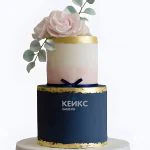 Свадебный торт бело-синий с бантиком розами и золотой окантовкой