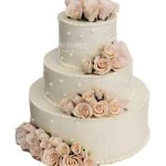 Этот нежный свадебный торт словно соткан из воздушных облаков. Три круглых яруса, покрытых гладкой бежевой мастикой, создают ощущение легкости и элегантности. Розовые цветы с тончайшими лепестками, будто только что сорванные с весеннего куста, изящно украшают каждый уровень. Жемчужные бусины, рассыпанные между цветами, добавляют торту нотку роскоши и торжественности. Композиция выглядит одновременно просто и изысканно — как сама любовь, которую празднуют в этот день.