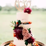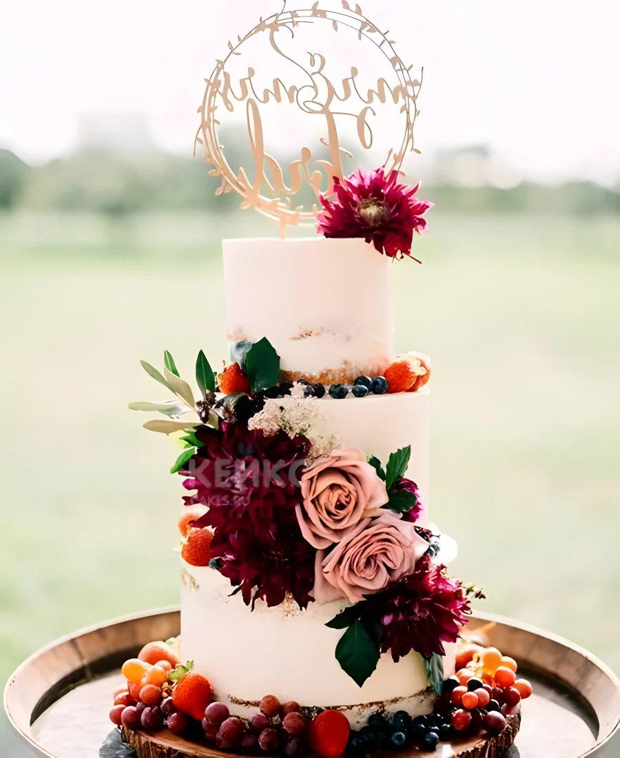 Свадебный торт трехъярусный с надписью, изобилием фруктов и цветов