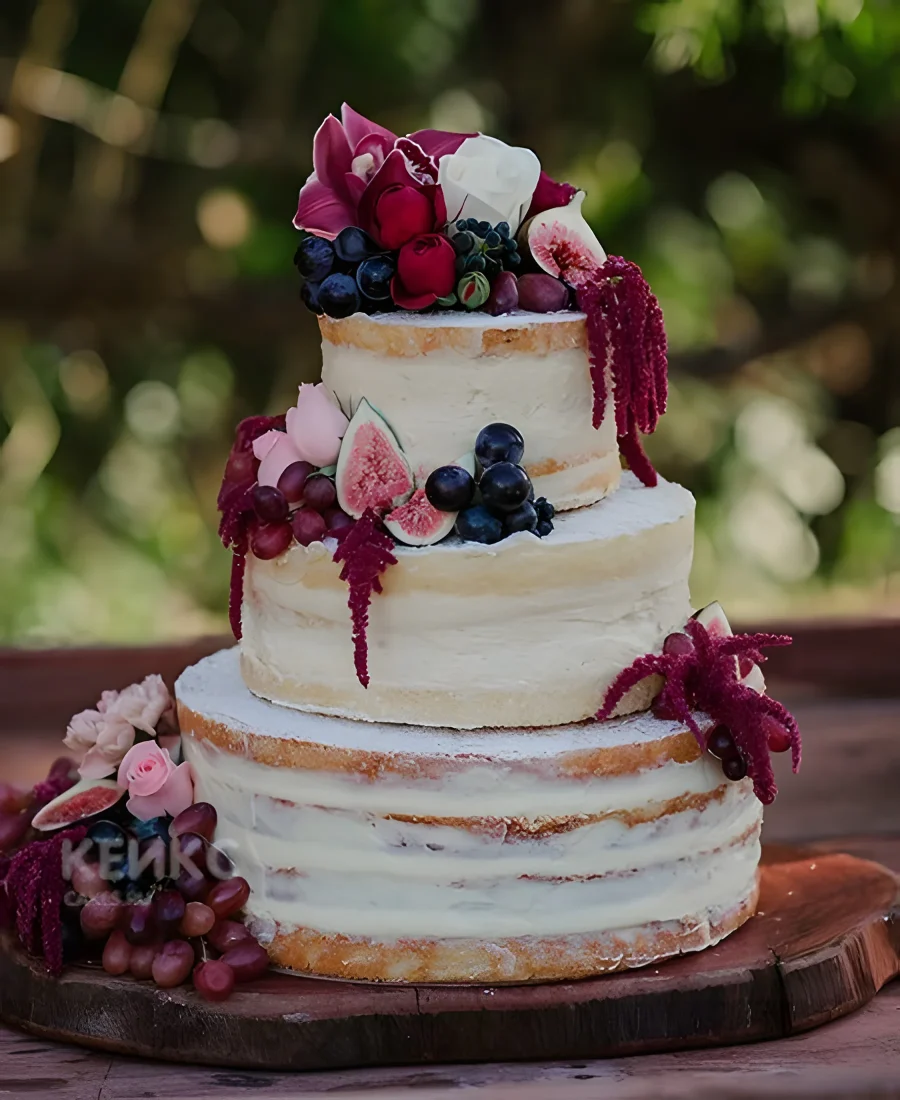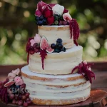 Трехъярусный торт с бордовым декором на свадьбу