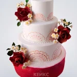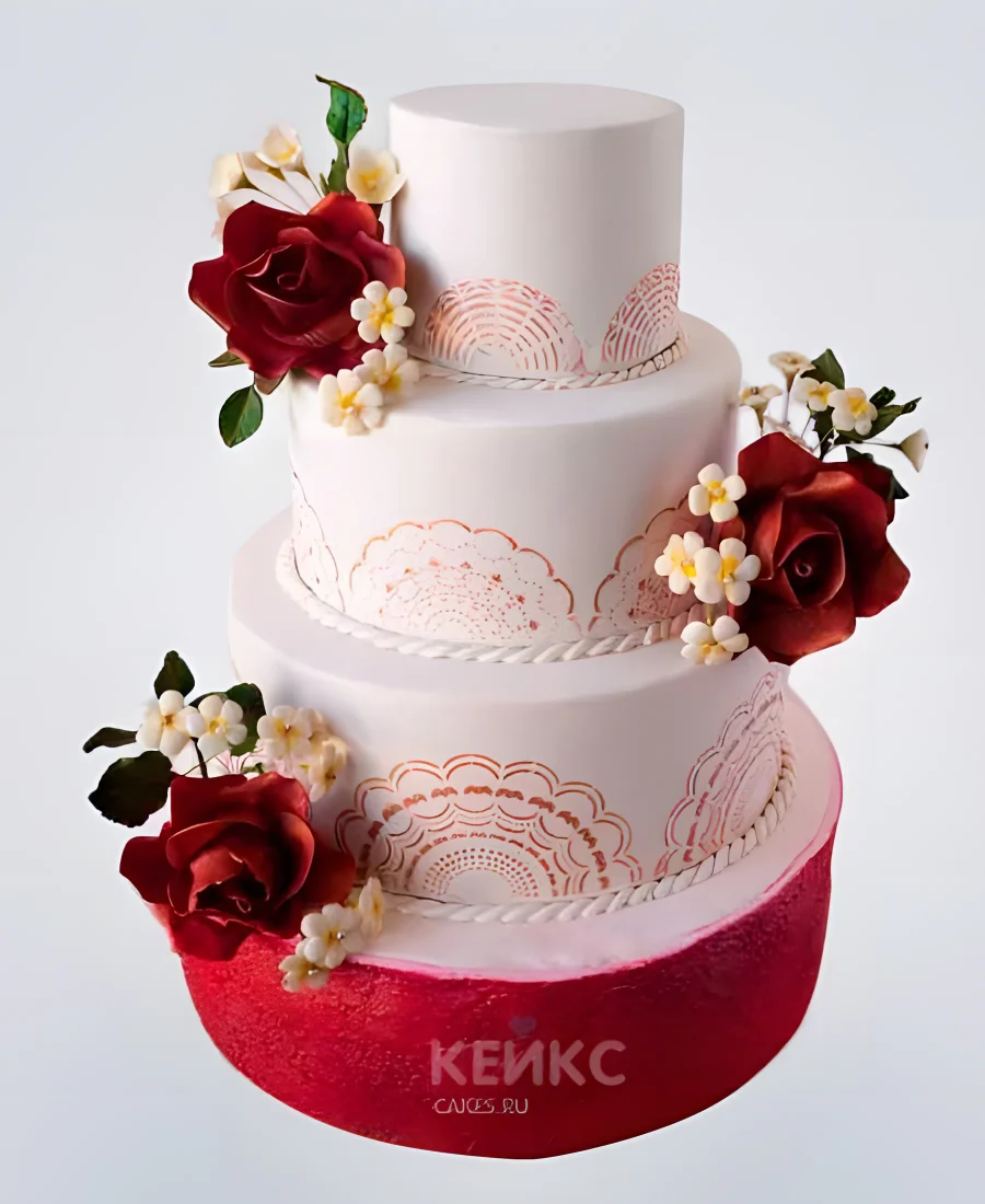 Свадебный торт с красным кружевным рисунком и бордовыми цветами