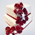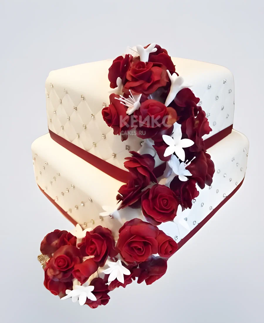 Квадратный свадебный торт со стразами и бордовыми цветами