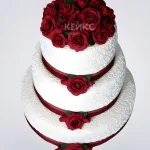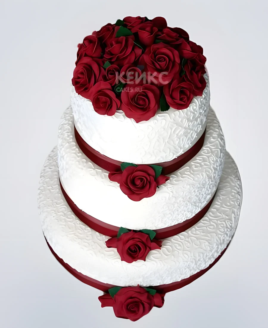 Свадебный торт трехъярусный с шапкой из бордовых роз