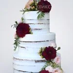 Этот свадебный торт словно воплощение нежности и роскоши. Три яруса с открытыми коржами создают эффект воздушности, а глубокий бордовый оттенок придает торту благородство. Крупные георгины и нежные эустомы спускаются каскадом, переплетаясь с зеленью, словно живой цветочный водопад. Контраст матовой поверхности и глянцевых акцентов добавляет торту изысканности. Каждый элемент продуман до мелочей, создавая гармоничную композицию, которая станет центром внимания на любом торжестве.