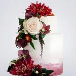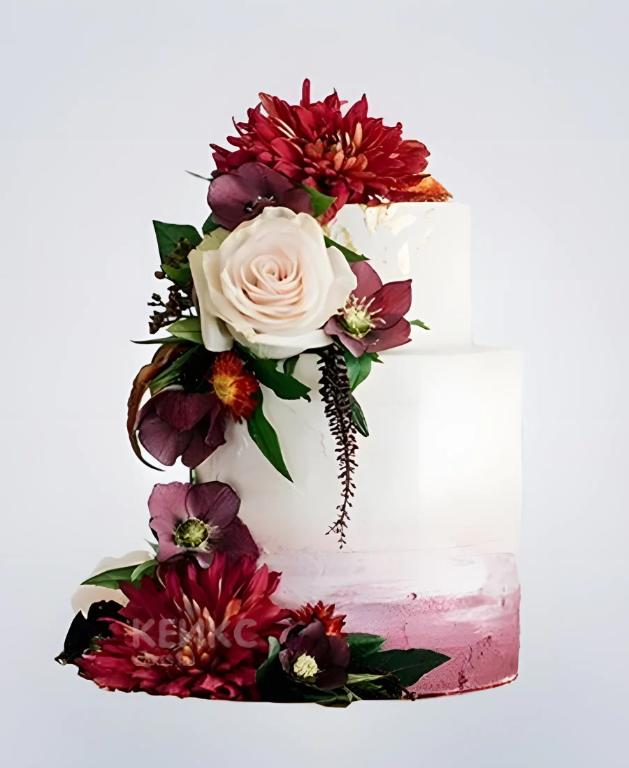 Свадебный торт двухъярусный в бордовых тонах с листвой