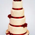 Свадебный торт четырехъярусный и алыми лентами и розами