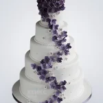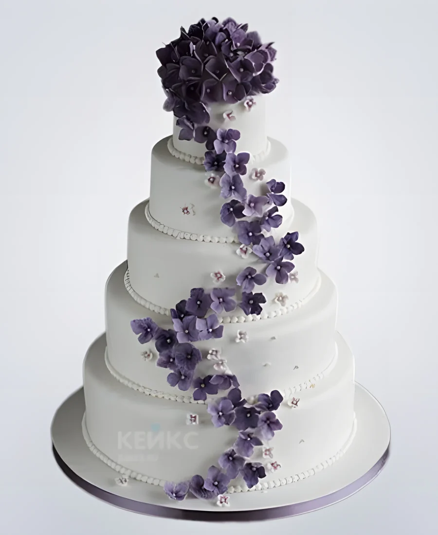 Высокий белый свадебный торт украшенный фиолетовыми цветами