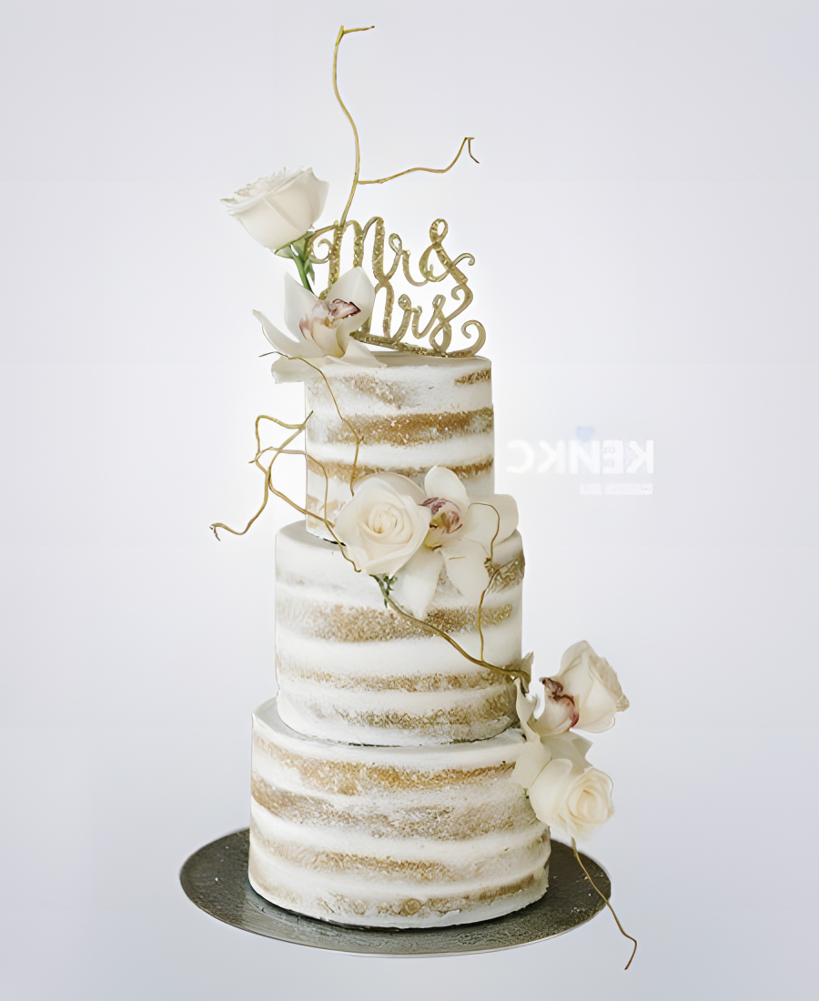 Свадебный торт голый с цветами, надписью и золотой веточкой