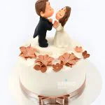 Нежный свадебный торт в пастельных тонах с романтичными деталями. Круглая форма с гладкой мастикой цвета слоновой кости создает элегантную основу. Главный акцент — трогательные фигурки молодоженов в объятиях, выполненные из мастики. Тонкие золотистые линии и изящные цветочные элементы добавляют торжественности. Легкие складки на покрытии имитируют свадебную фату, подчеркивая нежность момента.