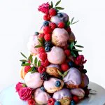 Свадебный торт Крокембуш розовый с ягодами и розами