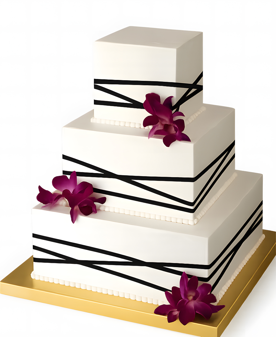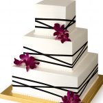 Квадратный свадебный торт с черной ленточкой и цветами