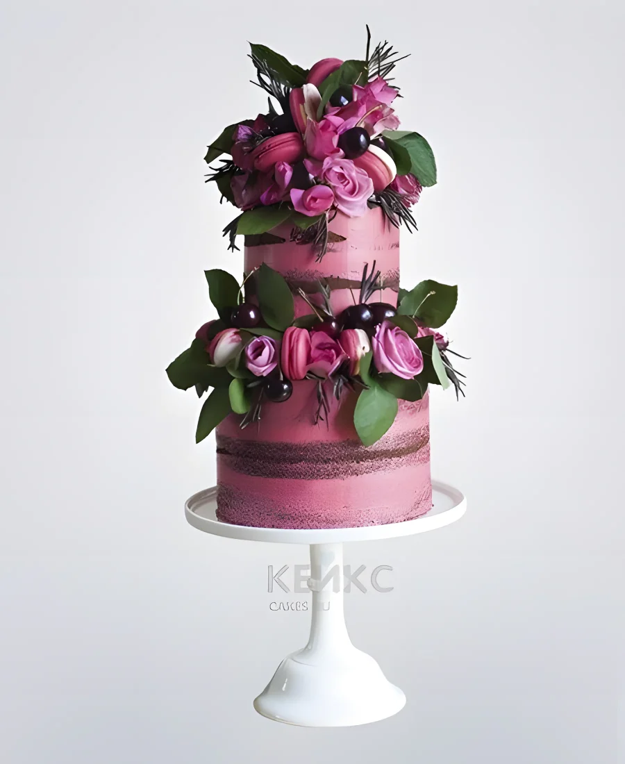 Маленький свадебный торт фиолетовый с эустомой, вишнями и макаруни