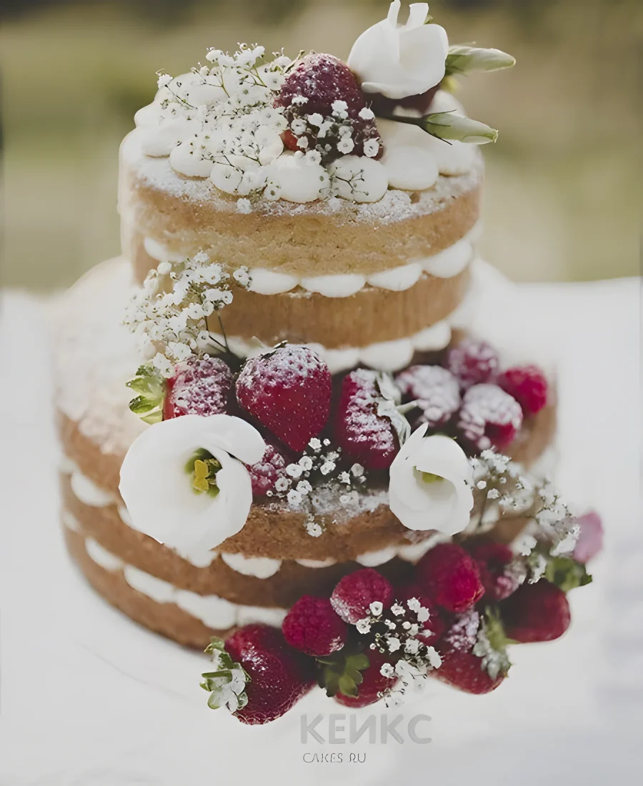 Свадебный торт маленький малина, клубника, эустома и гипсофила