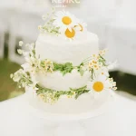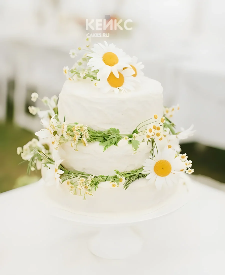 Маленький свадебный торт украшенный большими и маленькими ромашками