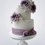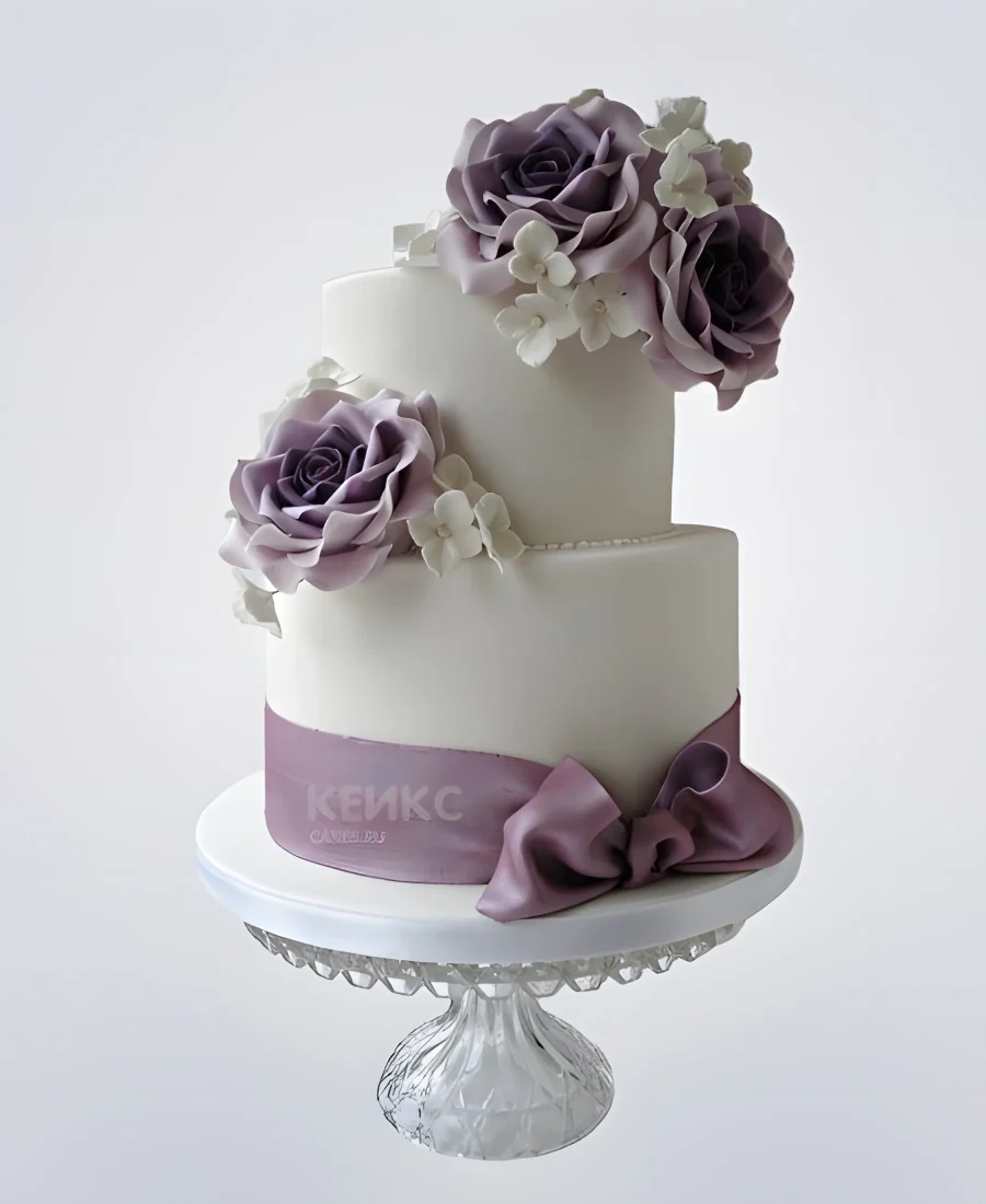 Белый маленький свадебный торт с фиолетовыми цветами и бантиком