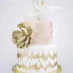 Маленький свадебный торт с золотым цветком и лебедями