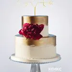 Бело-золотой маленький свадебный торт с бордовым пионом и сердцем