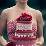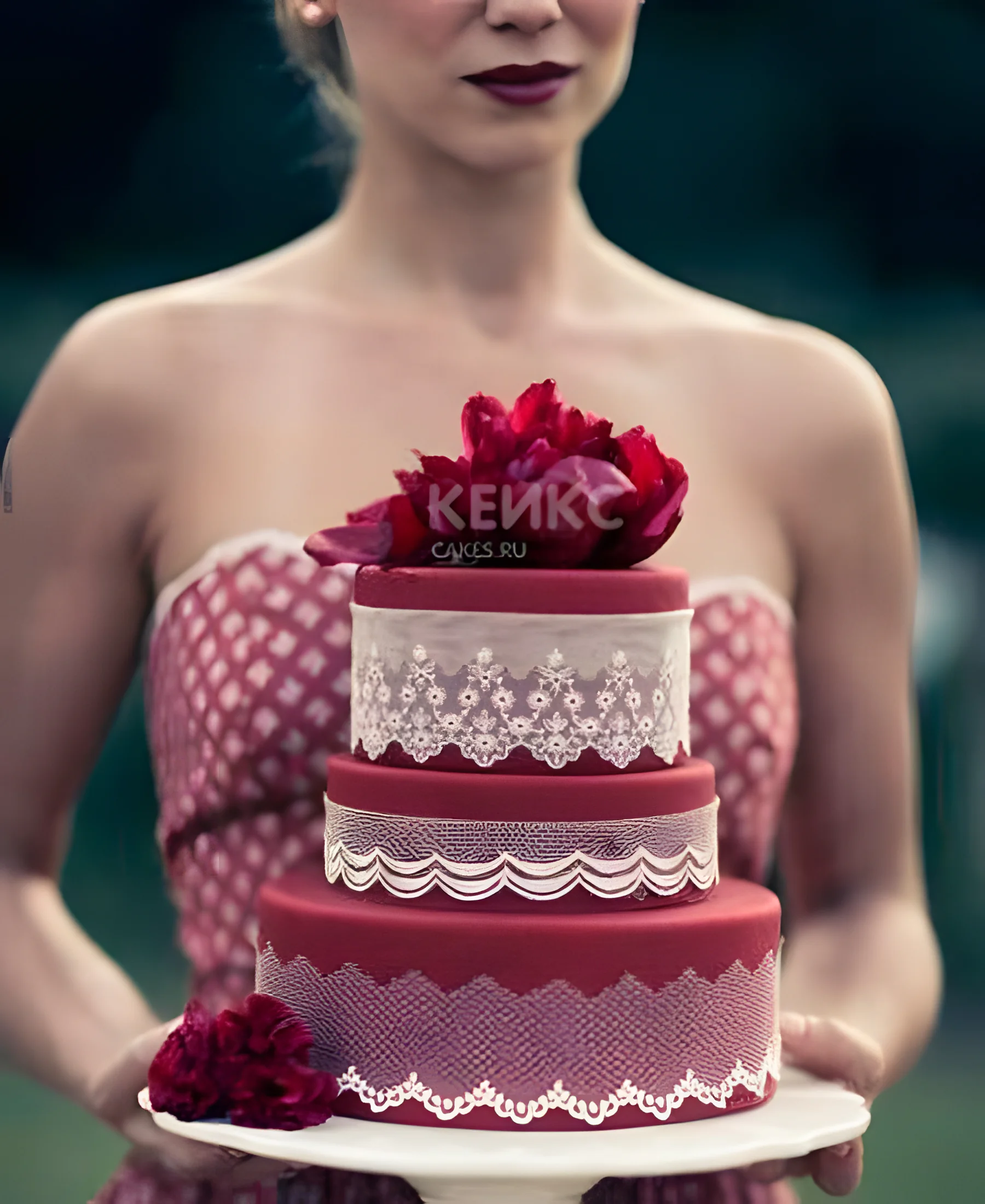 Свадебный торт марсала ажурный узор, бордовые цветы