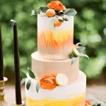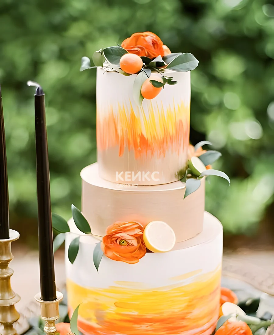 Шикарный свадебный торт в персиковых тонах с мандаринами и цветами