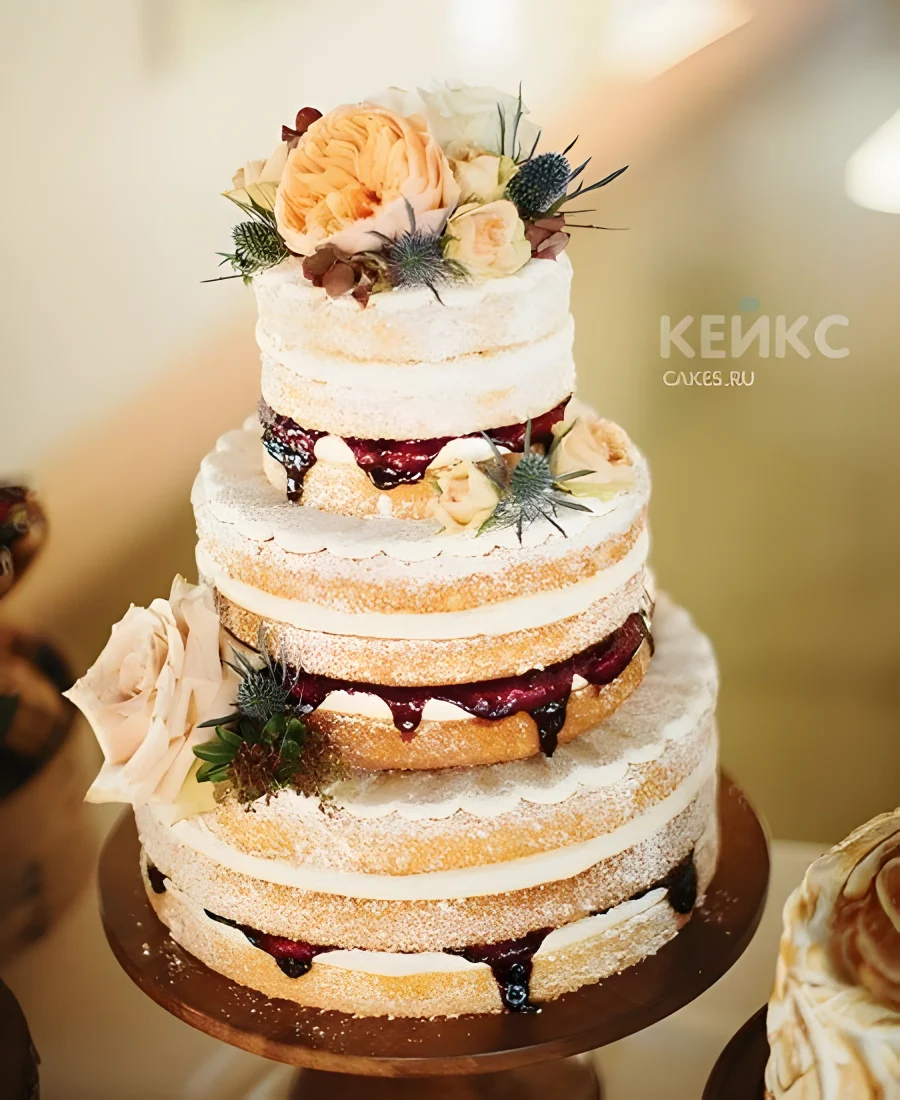 Свадебный торт с открытыми коржами, розы и эрингиум