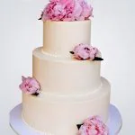 Трехъярусный свадебный торт в нежных бежевых тонах украшен искусными розами и пионами. Цветы из мастики нежно-розовых оттенков создают романтичную воздушную композицию. Элегантная круглая форма и пастельная гамма вызывают ощущение нежности и праздничного настроения. Каждый элемент декора гармонично сочетается, создавая целостный визуальный образ для особенного события.