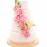 Белый свадебный торт с водопадом розовых роз