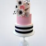 Свадебный розовый торт с черно-белыми полосами и цветами