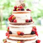 Трехъярусный торт в деревенском стиле очаровывает своей естественной эстетикой. Открытые коржи создают текстурный контраст с нежными сливочными слоями. Сочные ягоды — малина, ежевика, черника — рассыпаны живописными группами, добавляя яркие акценты. Декор из зелени и цветов завершает романтичный образ, идеально передающий дух свадебного торжества.