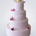 Свадебный торт фактурный с розовыми бабочками и белыми орхидеями
