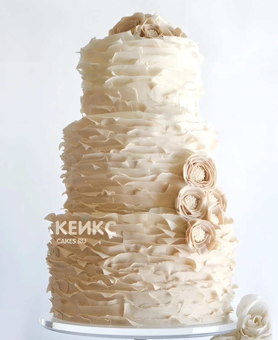 Трехъярусный свадебный торт кремового цвета украшенный цветами