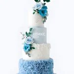 Свадебный торт с голубыми рюшами белыми узорами и цветами