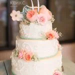 Свадебный трехъятусный торт с инициалами, украшен узором и цветами