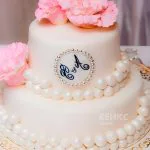 Двухъярусный нежно-розовый торт с инициалами и жемчугом