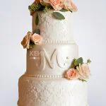 Торт свадебный трехъярусный розовый перламутр с инициалами и розами