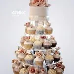 Дымчато-розовый свадебный торт с капкейками украшенный розами