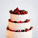 Большой кружевной свадебный торт с клубникой и другими ягодами
