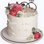Свадебный торт с кольцами Мистер и Миссис с розами и жемчугом