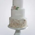 Элегантный трехъярусный свадебный торт в нежных белых тонах. Изысканное кружево тонкой работы украшает каждый ярус, создавая воздушную текстуру. В центре композиции — роскошный цветок, добавляющий торжественности образу. Чистые линии и гармоничные пропорции подчеркивают утонченность декора. Светлая цветовая гамма наполняет образ легкостью и романтическим настроением, идеально передавая атмосферу особенного дня.