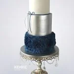 Серебристо-белый свадебный торт с синими кружевами