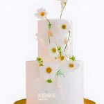 Нежный свадебный торт в пастельных тонах украшен изящными ромашками, создающими ощущение летнего цветущего луга. Два яруса покрыты мягким кремом с деликатной текстурой, а живописная композиция из цветов придает торту особую воздушность и романтичное настроение. Светлые оттенки и натуральная эстетика цветов вызывают чувство легкости и гармонии.