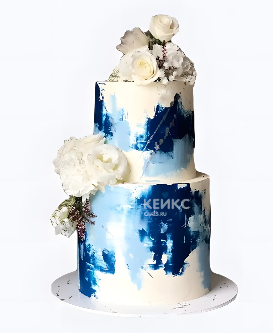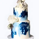 Свадебный торт с синими мазками и белыми цветами