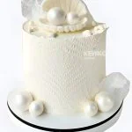 Этот свадебный торт словно драгоценная шкатулка, наполненная изысканными деталями. Нежный кремовый оттенок основы гармонично сочетается с перламутровыми жемчужинами, рассыпанными по поверхности. Тонкие золотистые линии создают эффект старинного узора, напоминающего античные фрески. Каждый элемент декора продуман до мелочей — от изящных завитков до деликатных жемчужных россыпей. Торт выглядит как настоящее сокровище, достойное королевского праздника.